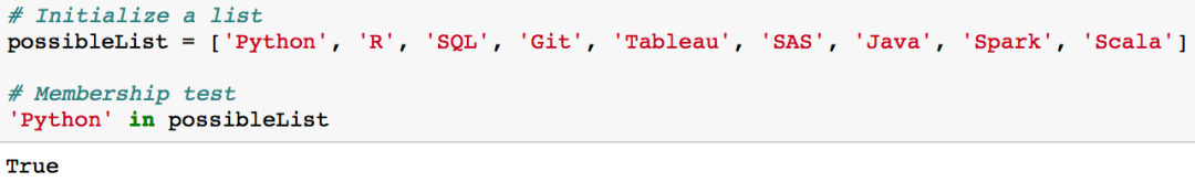 下面的代码展示了使用列表做成员检测的过程: