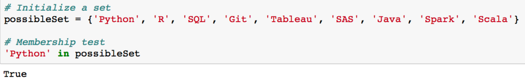 由于「possibleSet」是一个集合,而且「Python」是集合「possibleSet」中的一个元素,这可以被表示为「Python' ∈ possibleSet」如果你有一个不属于集合的值,比如「Fortran」,这可以被表示为「Fortran' ∉ possibleSet」。