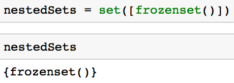 嵌套集合的问题在于,集合中通常不能包含集合等可变的值。在这种情况下,你可能希望使用一个不可变集(frozenset)。除了值不可以改变,不可变集和可变集是很相似的。你可以使用「frozenset()」创建一个不可变集。