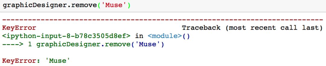 这种方法的一个缺点是,如果你想要删除一个集合中不存在的值,系统会返回一个键值错误「KeyError」。