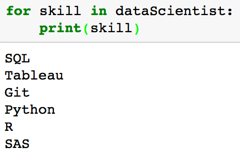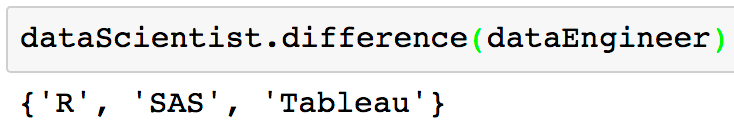 dataScientist = set(['Python', 'R', 'SQL', 'Git', 'Tableau', 'SAS'])