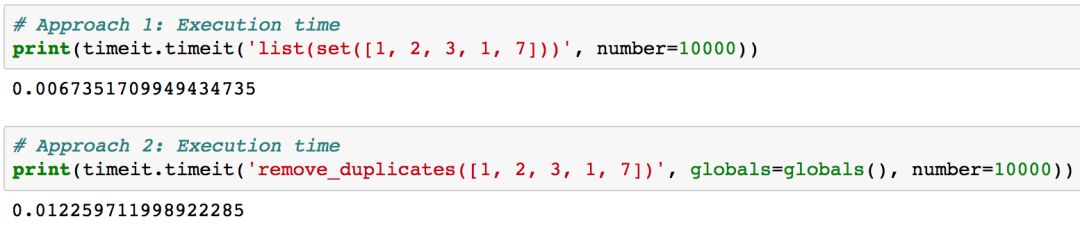 对比这两种方法,结果表明,使用集合删除重复值是更加高效的。虽然时间差异看似很小,但实际上在有一个非常大的列表时,能帮你节省很多的时间。