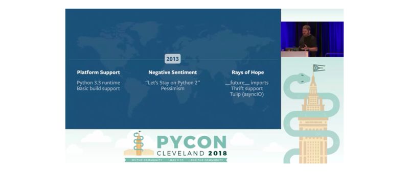 2014 年 8 月,他开始重写一个服务,并计划使用 gevent 和 Python 2,但他后来才意识到,如果这么做的话,在完成这个项目时它就过时了。为了有所改变,需要有人成为第一个做出改变的人。要在 Facebook 推动使用 Python 3,那个人非 Fried 莫属。