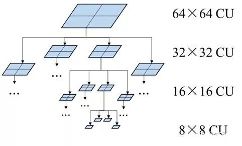 可见,从最大 64×64 到最小 8×8,多种可能的 CU 尺寸为 HEVC 标准提供了十分灵活的块分割方式,使编码器可以从中选出一种率失真代价最小的 CU 分割方案,作为实际编码结果。