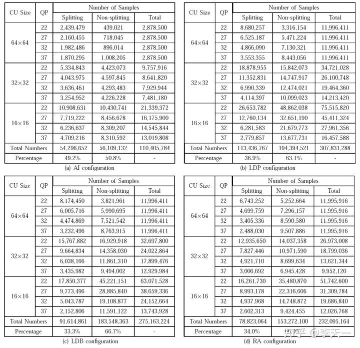 确定总体思路后,作者首先构建一个大规模的 CU 分割数据库,为训练神经网络提供数据支撑,并有望促进 HEVC 编码复杂度优化的后续研究。本数据库同时涵盖了帧内和帧间模式的全部四种配置(All Intra,Low Delay P,Low Delay B 和 Random Access,简称 AI,LDP,LDB 和 RA),其中帧内模式数据来自 2000 个无损图像,帧间的来自 111 个无损视频。所有数据均采用 4 个不同量化参数(Quantization Parameter,QP)压缩,以适应不同码率和编码质量。