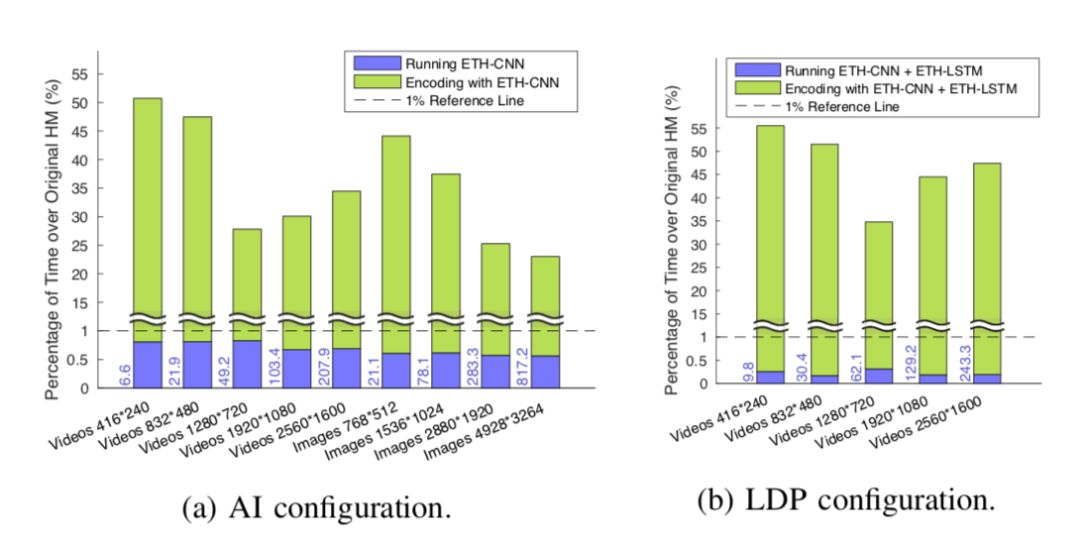 ▲ 图7. 编码时间构成。蓝柱和绿柱代表网络运行时间和本方法中HM编码时间占原编码时间的百分比,柱左侧的蓝色数字代表网络运行的绝对时间(单位毫秒)