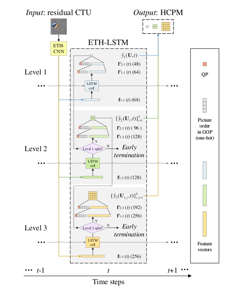 在帧间模式中,需要同时考虑 CTU 内容中的空间相关性,以及不同帧 CTU 内容的时间相关性。在 ETH-CNN 的基础上,作者进一步提出可以提前终止的分层 LSTM(early-terminated hierarchical LSTM,ETH-LSTM),来学习帧间 CU 分割的长、短时依赖关系。