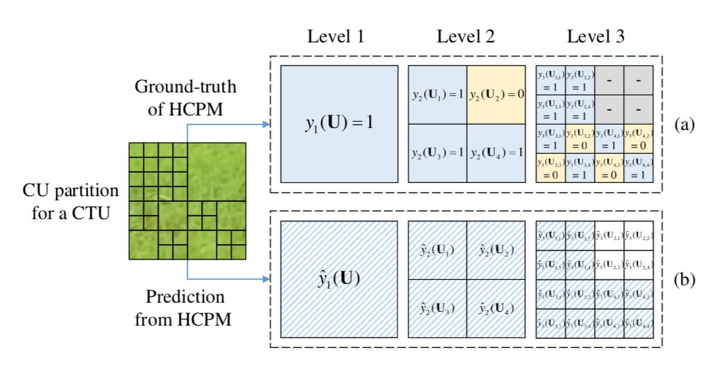 为解决这一问题,在本文的 HCPM 中,可直接将一个 CTU 输入到网络中,得到 1+4+16 个节点的结构化输出,来预测 CTU 中所有可能的 CU 是否分割。