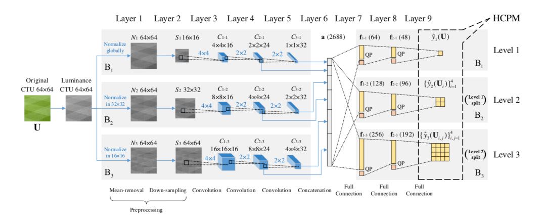 对 CTU 原始亮度矩阵进行去均值和降采样等预处理操作。为了适应最终的 HCPM 三级输出,从预处理层开始,输入信息就在三条并列的分支 B1、B2 和 B3 中操作。