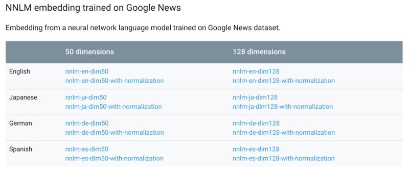 和以前一样,我们首先选择一个模块。TensorFlow Hub 有多种文本模块供您探索,包括各种语言的神经网络语言模型,以及在维基百科上训练的 Word2vec,以及在 Google 新闻上训练的 NNLM。