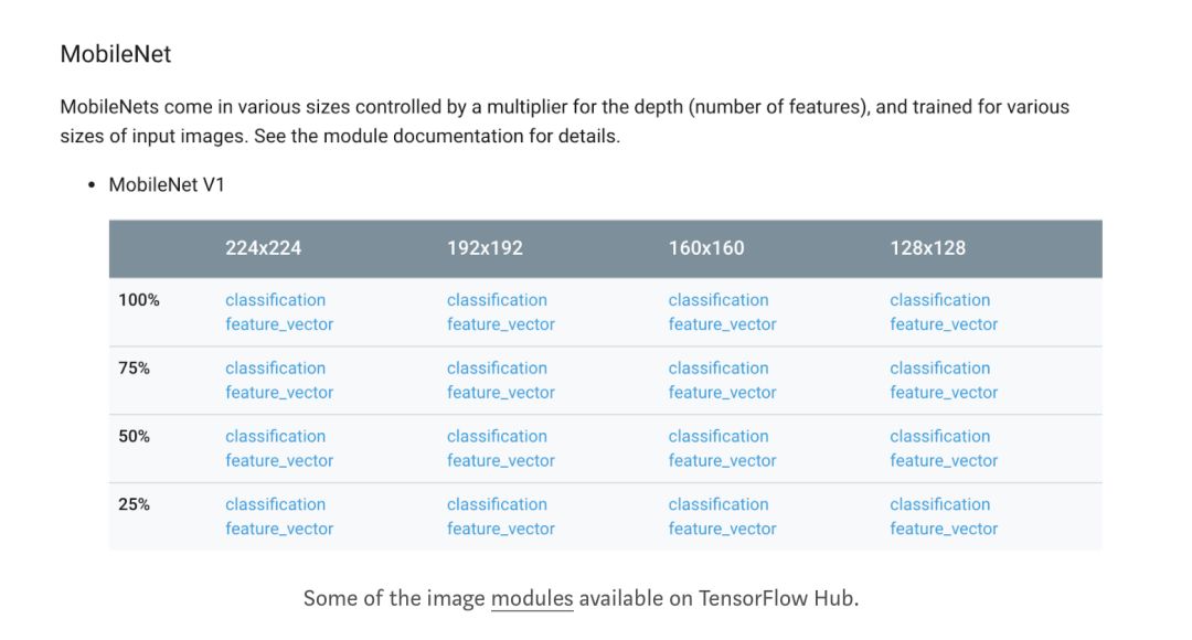 TensorFlow Hub 上有多种模块供您选择,包括 NASNet,MobileNet(包括最近的 V2),Inception,ResNet 等。要使用模块,请导入 TensorFlow Hub,然后将模块的 URL 复制/粘贴到代码中。