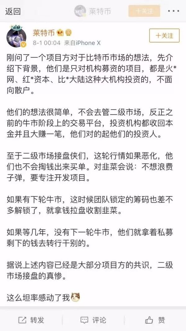最后,补充一句,如果你手里现在拿的币,你确认他开发进度正常,社区建设稳步发展,团队初心未改,倒是不用慌;如若不然,那就择机出掉,市场的融资模式将发展巨大的变化,是否裸泳,终要揭晓。