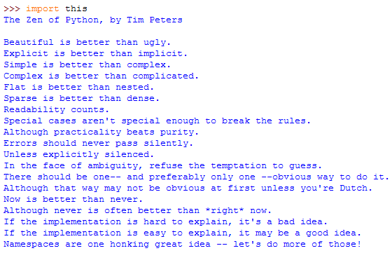 说到Python里面隐藏的彩蛋,PEP20算得上一个,在Python终端导入this模块,有二十条(其实是19条)关于Python编程的禅学,还不看过的可以在Python命令行输入 import this 试试,讽刺的是,this 模块的源代码晦涩难懂,这也是从作者从侧面来说明代码可读的重要性。