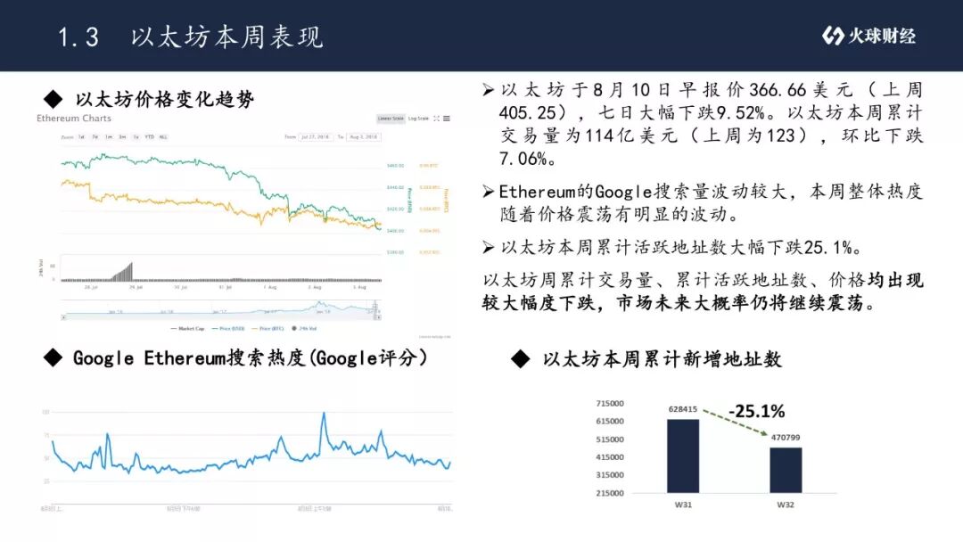 •本周主流数字货币的市值占比排名并未出现改变,其中Tether继续位列第9。比特币市值占比小幅上升,8月10日早报收49.02%(上周为48.74%)。以太坊本周市值占比小幅上涨,报收16.06%(上周为15.67%),市场整体变动不大