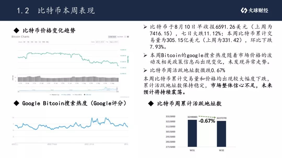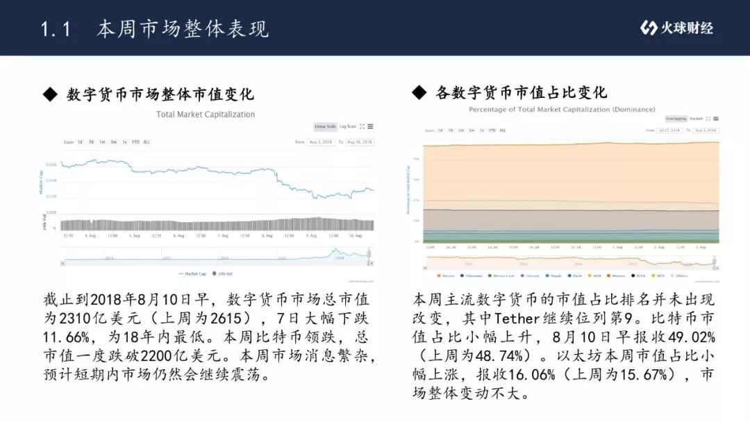 •截止到2018年8月10日早,数字货币市场总市值为2310亿美元(上周为2615),7日大幅下跌11.66%,为18年内最低。本周比特币领跌,总市值一度跌破2200亿美元。本周市场消息繁杂,预计短期内市场仍然会继续震荡。