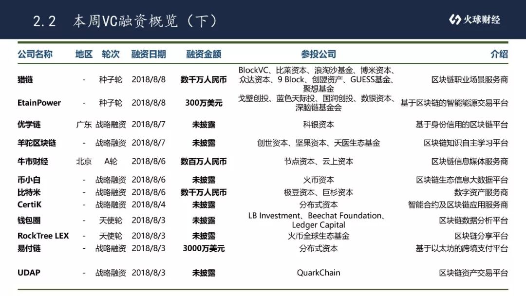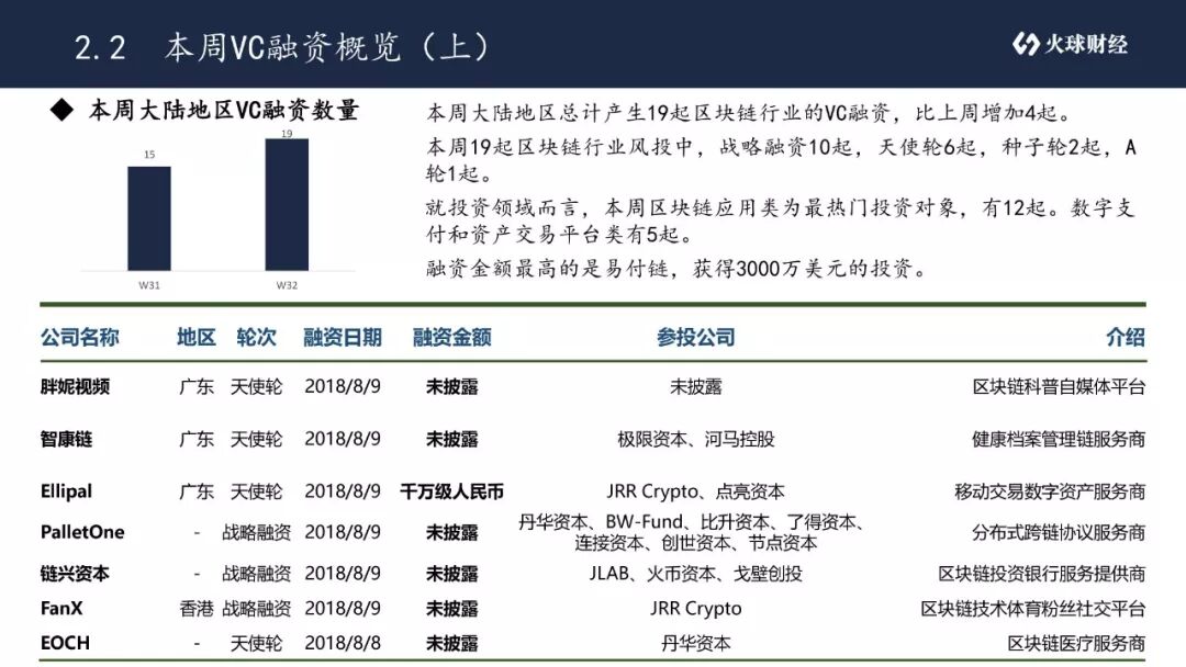 本周19起区块链行业风投中,战略融资10起,天使轮6起,种子轮2起,A轮1起。