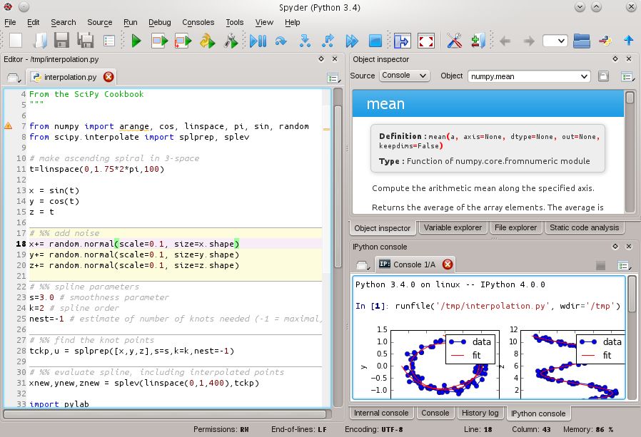 Spyder (前身是 Pydee) 是一个强大的交互式 Python 语言开发环境,提供高级的代码编辑、交互测试、调试等特性,支持包括 Windows、Linux 和 OS X 系统。Spyder是Anaconda科学计算工具中默认的开发工具,做数据分析、搞机器学习的人喜欢这个工具