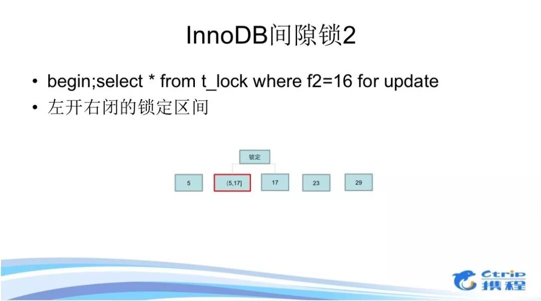 我们先建一个表,插入这四行数据,我们怎么理解这个间隙锁。假如前面做一个begin;select * from t_lock where f2=16 for update,在之前的表里面是没有数据,它在查询的过程中,实际上查到大于它查询条件的最小一条记录,它先定位这条记录,定位这条记录上之后,对这条记录的行锁加特殊标识,当其他事务进行插入的时候,因为它插入的时候一定查询到一个插入的点。