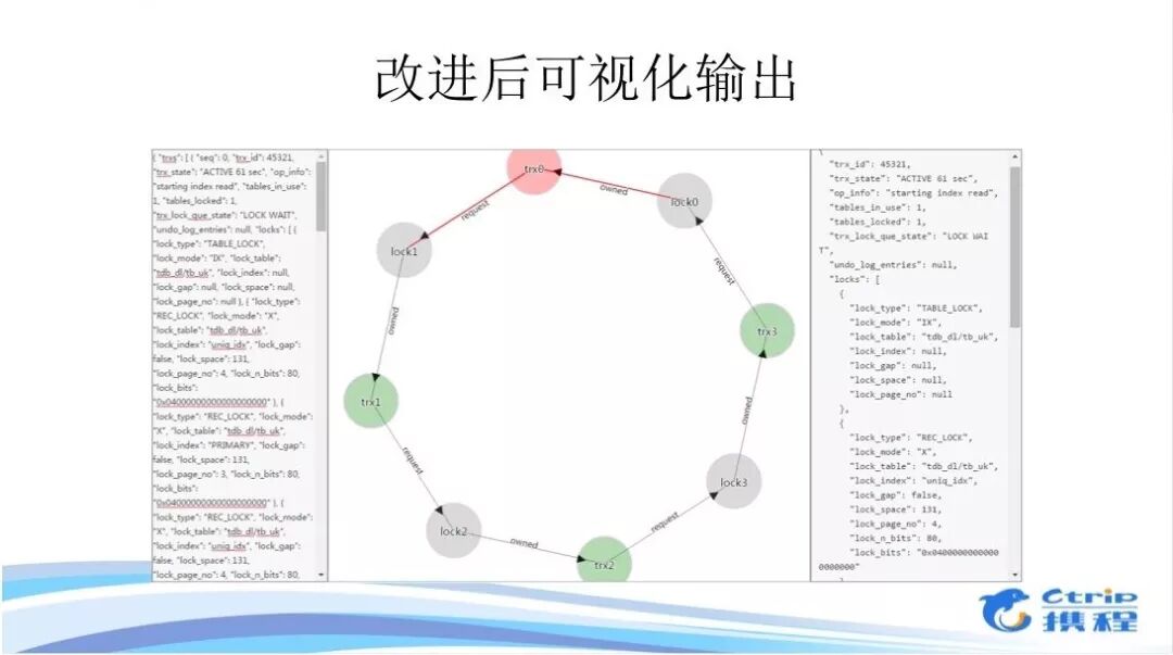 这里面,之前我们看图像里面打印一个锁信息,我们操作的时候把一个事务里面所有上锁信息全部打印出来了,可视化的操作时候就是把之前输出的信息全部拿出来之后,可以看到这样一个结果,这个对我们线上运维还是挺有帮助。不过有一个问题是什么,你判断不出来,这里面打印信息还是不够全,不能把所有锁涉及到的操作,就是产生所的语句打印出来,我们改进时候有一个配套工程,做一个MySQL的全量trx输出,实际上运维可以根据线上这些信息把当时开发所做的事情拿出来,定位开发的一些问题。