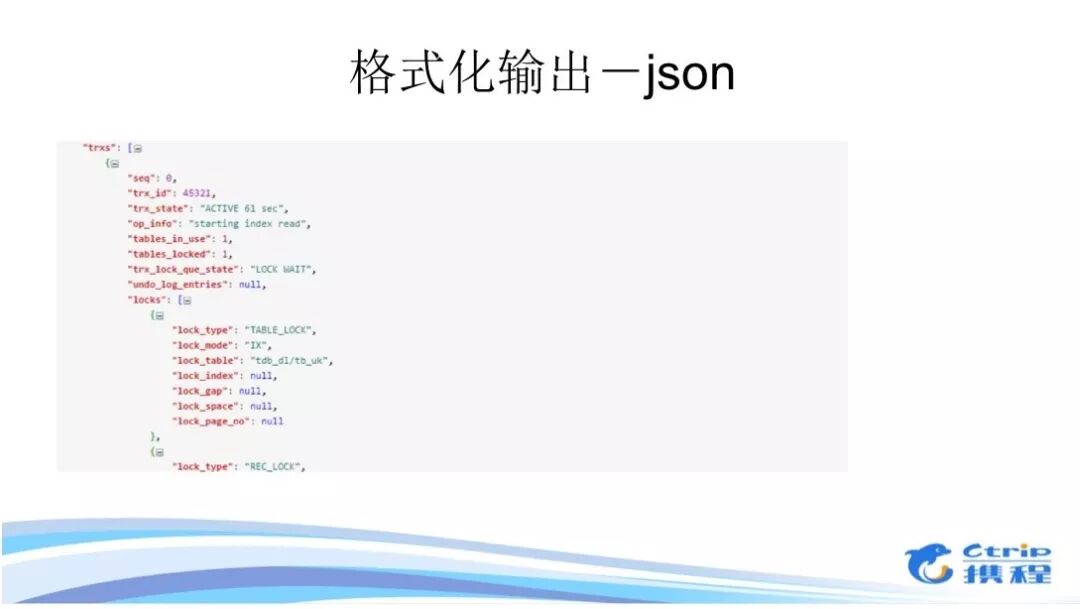 打印这个信息,这个信息不够格式化,产生的内容不好读。第二点,不能把所有参与到死锁里面的事务全部打印出来,我们针对这种情况,实际上我们做了改造,我们希望能把这些信息都格式化出,而且可视化展示。我们做了格式化输出,把它都输出成这个格式,后面是一个数组,哪些事务全部打印出来。