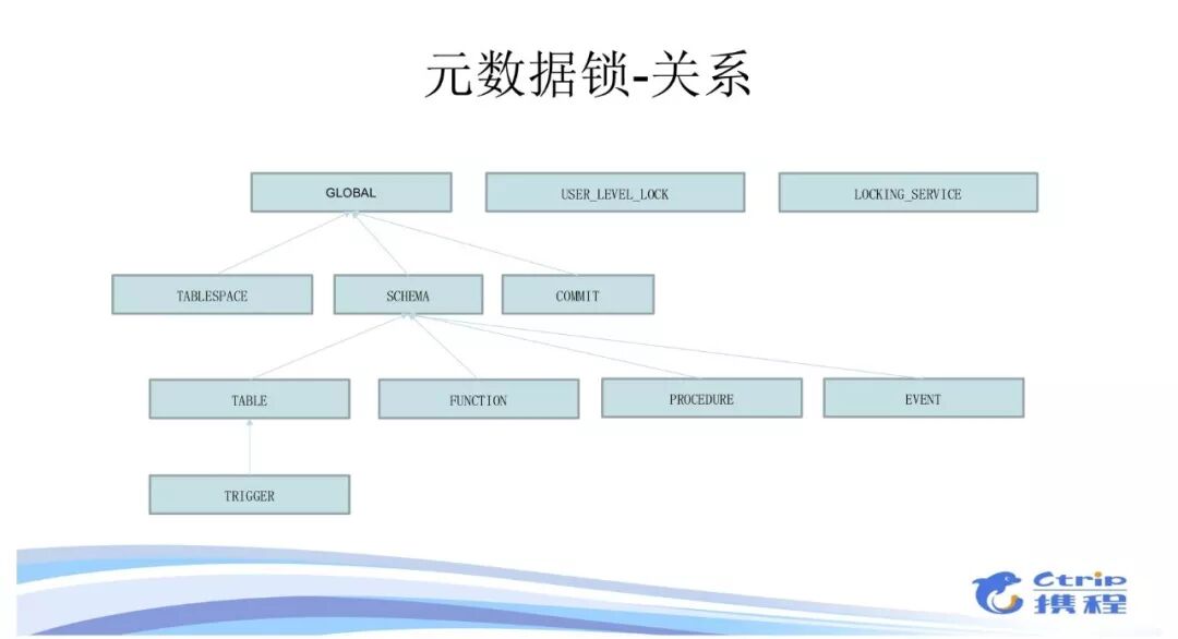 类型有这么多数据锁,这张图可以看到数据锁之间的看到。global锁下面,它所谓的关系是什么?这里面关系是在大部分情况下,如果我要对这里面某一个元数据上锁的时候,它有一些前置锁。