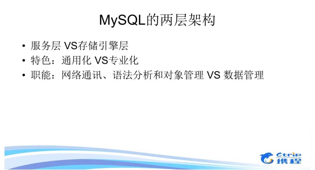首先我先介绍一下MySQL两层架构,MySQL的两层架构所有数据库里面,除了MySQL以外,其他数据库都没有这个特点,MySQL两层架构就是它把服务层和存储引擎层拆成两个层次来看待,服务层集中所有通用化的功能,如网络通讯和语法分析等工作。