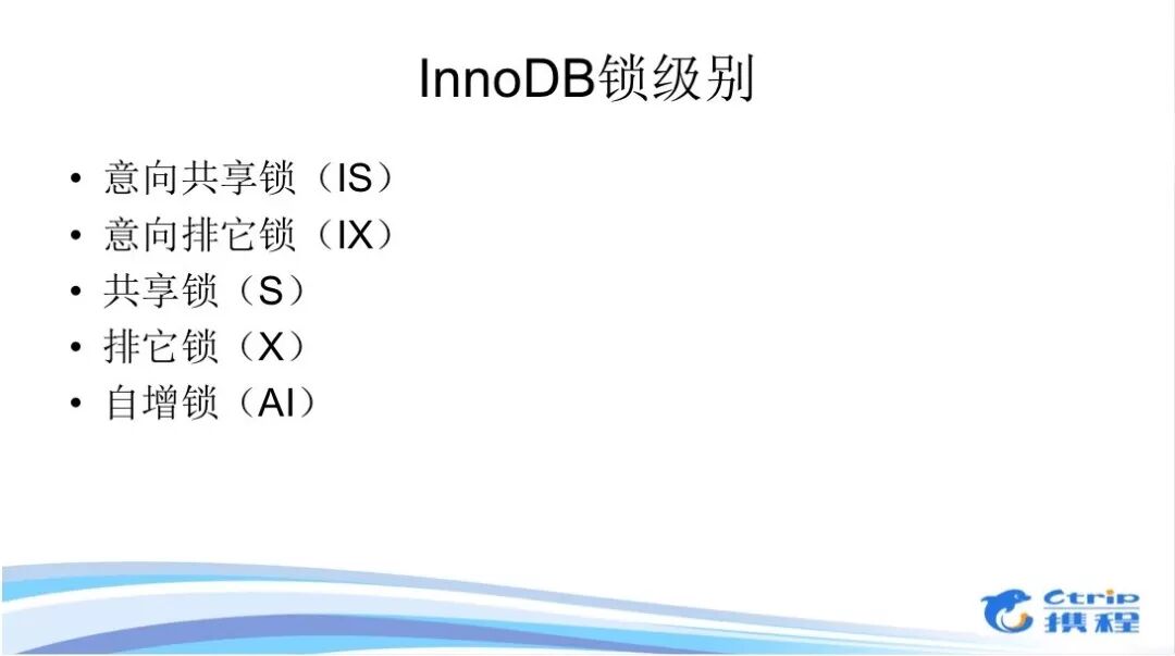 它有意向共享锁、意向排它锁和共享所、排他锁、自增锁,自增锁是InnoDB自己实现的自增列的锁,这是全局锁,排它性是这样。它是直接列的数组矩阵,兼容性就是这样子。通常情况下不会碰到IS锁和X锁冲突情况。S锁和X锁放在表级锁,IS锁和IX锁放在进入级别上面。