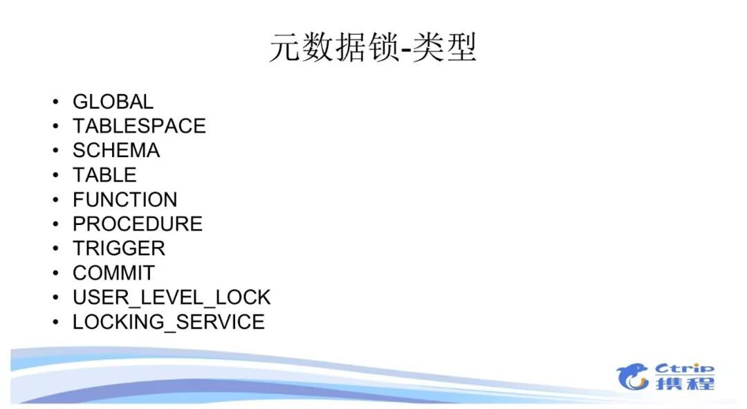 还有一个schema,schema是MySQL里面有一个概念上的混淆,这里面元数据锁对应schema的对象,还有我们下面FUNCTION锁、PROCEDURE锁、TRIGGER锁,这三个锁,commit锁,我在commit提交的时候,它需要持有让COMMIT串行化方式的锁,并不常见到,但是每次commit一定都会有,它和global差不多的。