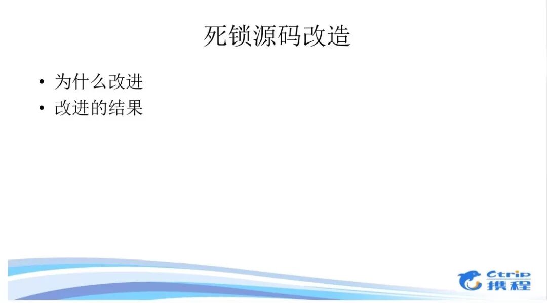 我再讲一下携程做了相关的事务锁的改造,这个是我们最 常见碰到的现象,发生死锁一定出这个东西,下面的红框产生死锁,这个操作产生死锁的事务,上面是它前面的一个事务,假设我们有一个环,这个操作造成死锁,一直到后面产生闭环,这是一个死锁。