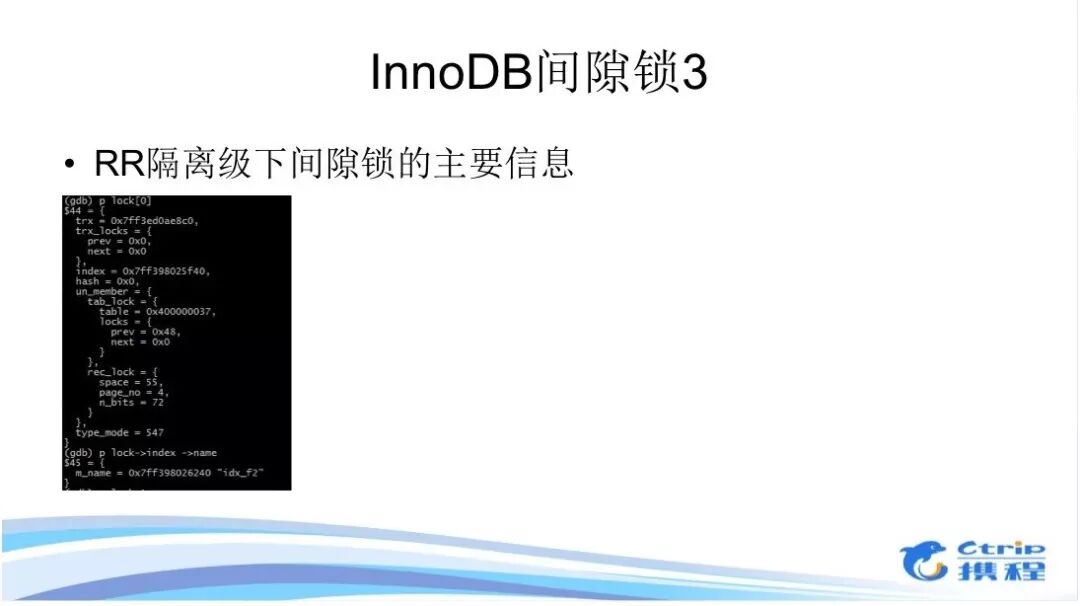 我们再讲一下间隙锁,看一下间隙锁在内存里面打印的结果,MySQL锁结构非常简单,就是整个lock打印出来就是这么多,锁处于哪一个事务,这个锁在哪一个index上,这是C里面特殊语法结构,告诉你上一个锁是table锁还是lock锁。这个是加特殊标识,分成16进制是512,这是间隙锁内存里面,打印出来间隙锁的样例。