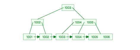 举个例子,假设userinfo表的userid字段上有主键索引,且userid目前的范围在1001~1006之间,则userid的索引B+树如下(这里只是为了举例,下图忽略了InnoDB数据页默认大小16KB、双向链表,并且假设B+树度数为3、userid顺序插入):