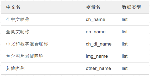 append (list_name[i]) if result == 'img' : # 含表情 img_name_number +=1 img_name.append (list_name[i]) if result == 'ch_di' : # 中文和数字 ch_di_name_number +=1 ch_di_name.append (list_name[i]) if result == 'other' : # 其他 oth_name_number +=1 oth_name.append (list_name[i])print ("纯中文昵称个数:" + str(ch_name_number)) # print (ch_name)print ("纯英文昵称个数:" + str(en_name_number)) #print (en_name)print ("纯数字昵称个数:" + str(di_name_number)) # print (di_name)print ("包含表情图昵称个数:" + str(img_name_number)) # print (img_name)print ("中文和数字混合昵称个数:" + str(ch_di_name_number))print (ch_di_name)print ("其他昵称个数:" + str(oth_name_number)) # print (oth_name)