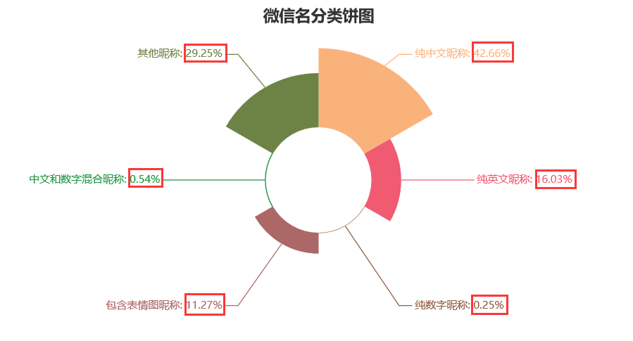 从中可以看出,微信昵称为全中文的占比最多,占有42.66%,其次为其他昵称(中英文混合、字符等类型 ),占有29.25%。