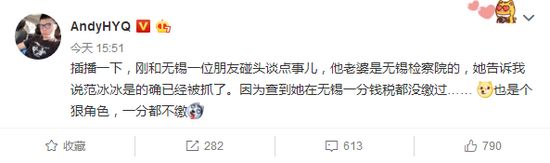 昨日下午,黄奕前夫黄毅清微博发文透露范冰冰已被无锡检察院逮捕。有网友质疑其真实性,黄毅清随后发文反驳:我是不会去故意编造什么哗众取宠的内容为了博关注的,肯定是消息来源很可靠的我才会发出来。随后,微博大V辣笔小球补充爆料,称范冰冰是在南京被捕。