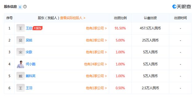 而在这家新成立的公司中,这些好友也为王欣出资站台。在股权结构上,王欣持股比例高达91.5%,是公司最大股东;其他五位股东吴铭、戴科英、宋歌、何小鹏、王羽分别持股5%、1%、1%、1%和0.5%。