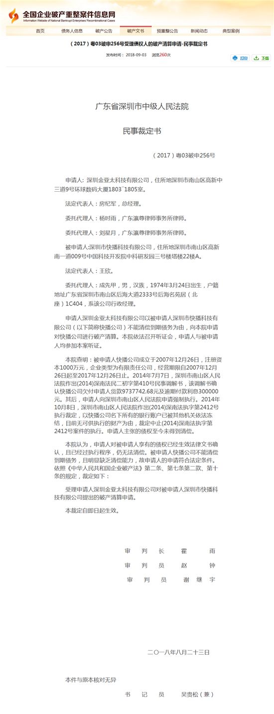今日,全国企业破产重整案件信息网披露,深圳金亚太科技有限公司对快播提出破产清算申请,广东省深圳市中级人民法院裁定该申请即日起生效。裁定时间为2018年8月23日。