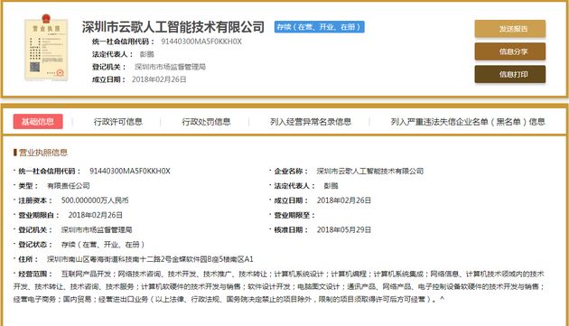 同时,据新京报报道,从工商信息系统查阅发现,由王欣控股的深圳云歌人工智能技术有限公司于今年2月26日成立,注册资本500万,法人代表是王欣妻子彭鹏,公司经营范围为互联网产品开发等。