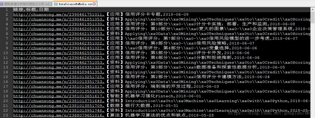 使用pandas的read_csv函数读取爬取的csv文件,循环遍历“链接”,“标题”,“日期”
