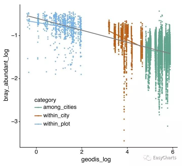 plot_abundant.save('bacter_ddr11.pdf',width=6, height=5.5) 做相关性分析分组和整体 我们可以同时按照分组和不分组的方式对x和y做相关性分析,这个和其他可视化软件比如sigmaplot相比就显得非常人性化,可以同时叠加多个图层,而在sigmaplot则可能需要添加新的数据分组。
