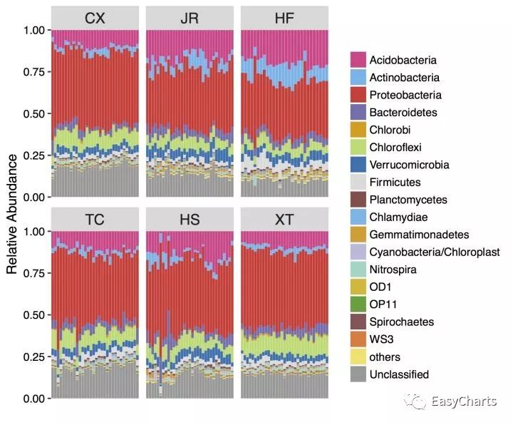 MyColors 相对丰度堆积柱状图 和在ggplot2中相同,bar距离x轴和y轴的距离可以通过scale_y_ continuous(expand=[0,0,0.1,0])调整而不需要保留空白一看就能看出来是ggplot2画的图。当然我们也可以通过添加分面的方式,把不同的组别分开只需要加上facidwrap(~group,scale="free_x "),按照什么类型分面,可以根据自己的需求修改画图导入的metadata。