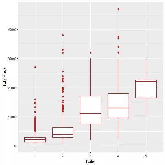 ggplot(DATA,aes(x=Toilet,y=TotalPrice))+geom_boxplot(col="red")