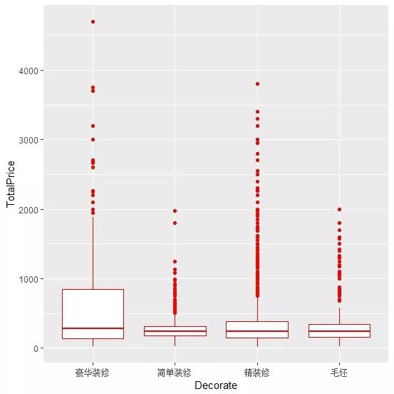 ggplot(DATA,aes(x=Decorate,y=TotalPrice))+geom_boxplot(col="red")