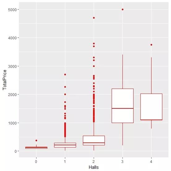 ggplot(DATA,aes(x=Halls,y=TotalPrice))+geom_boxplot(col="red")