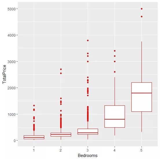 ggplot(DATA,aes(x=Bedrooms,y=TotalPrice))+geom_boxplot(col="red")