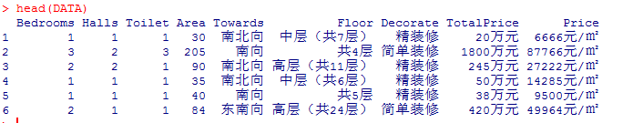 DATA$BedroomsDATA$HallsDATA$ToiletDATA$AreaDATA$TotalPriceDATA$PriceDATA$TowardsDATA$Decoratestr(DATA)