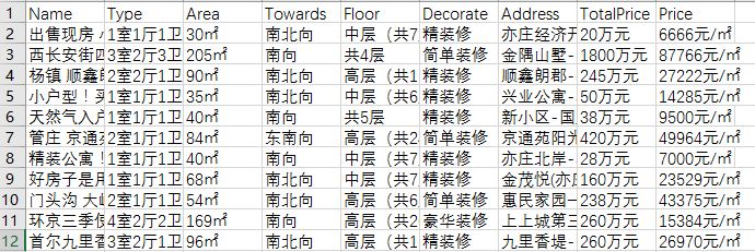 fieldnames = ['Name', 'Type', 'Area', 'Towards', 'Floor', 'Decorate', 'Address', 'TotalPrice', 'Price']