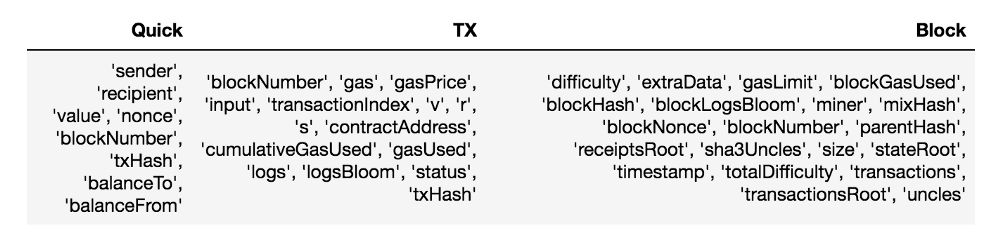 变量的命名约定相对于原始的web3py略有改变,以消除歧义,例如将块哈希和交易哈希都称为“哈希”,或使用“from”/“to”作为列名,这在SQL有不同的含义,会使程序崩溃。