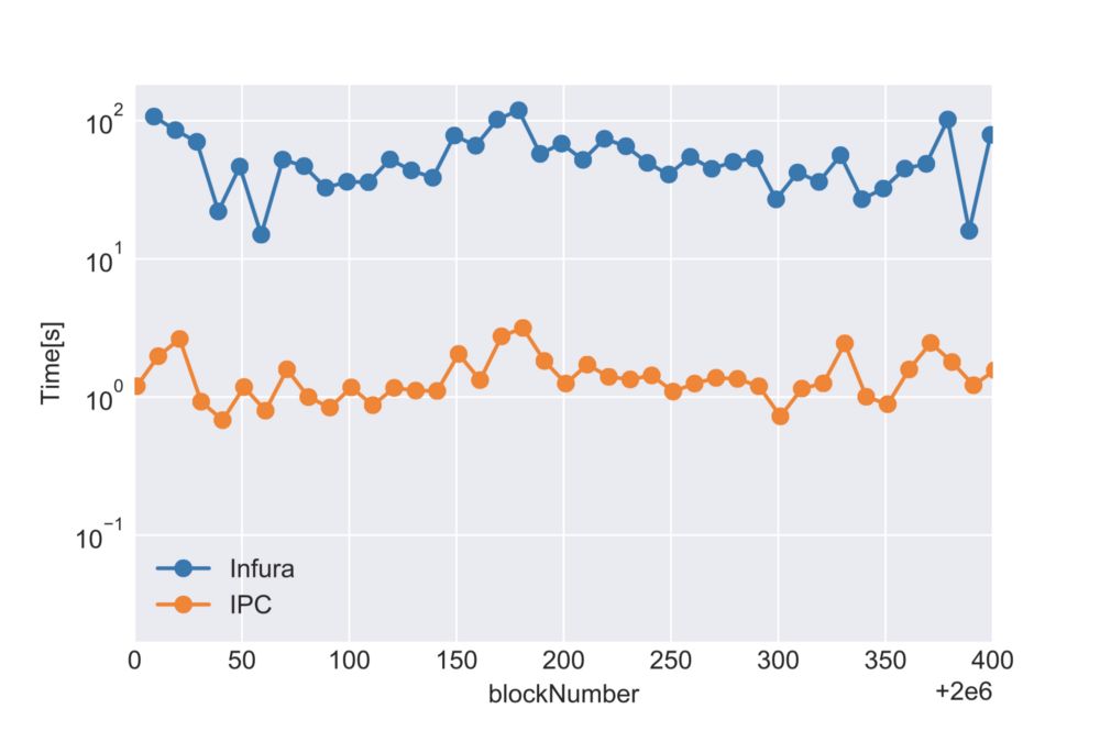 下面的图表显示了此代码写入数据库的速度,与本地完全同步的节点(IPC)与Infura(Infura)上的地址进行通信。正如你所看到的,在本地节点上运行此代码是值得的,因为你可以将速度提升近2个数量级(即100x)!