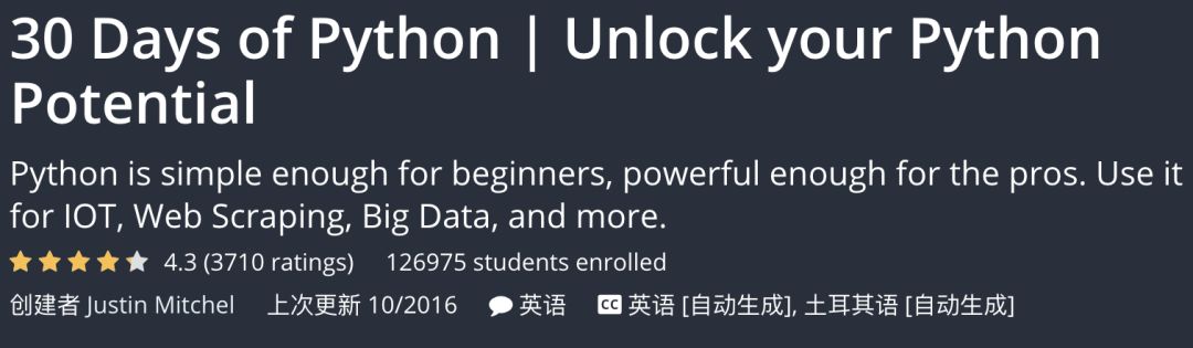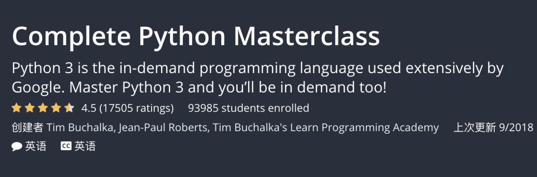 这是在Udemy上学习Python的另一门极好的课程。我是Tim Buchalka的超级粉丝,也参加过他的一些课程。