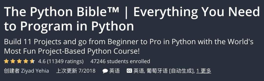 这是在Udemy上学习Python的另一门很棒的课程。这是一个基于项目的课程,你将在Python课程中构建11个项目。
